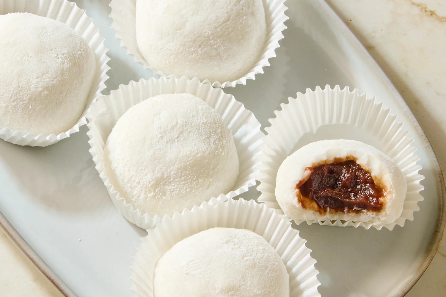 - Приготуйте начинку: Розділіть пасту з червоної квасолі на 12 рівних кульок (приблизно по 2 столові ложки кожна). Охолодіть у холодильнику, щоб воно застигло, поки ви готуєте тісто для моті.