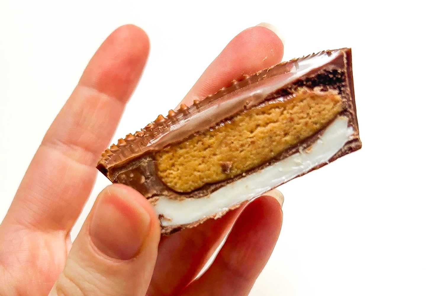 - Склад: Верхній шар зберігає традиційний профіль Reese’s – шоколад та арахісову пасту. Однак у нижній частині знаходиться шар начинки зі смаком маршмеллоу.