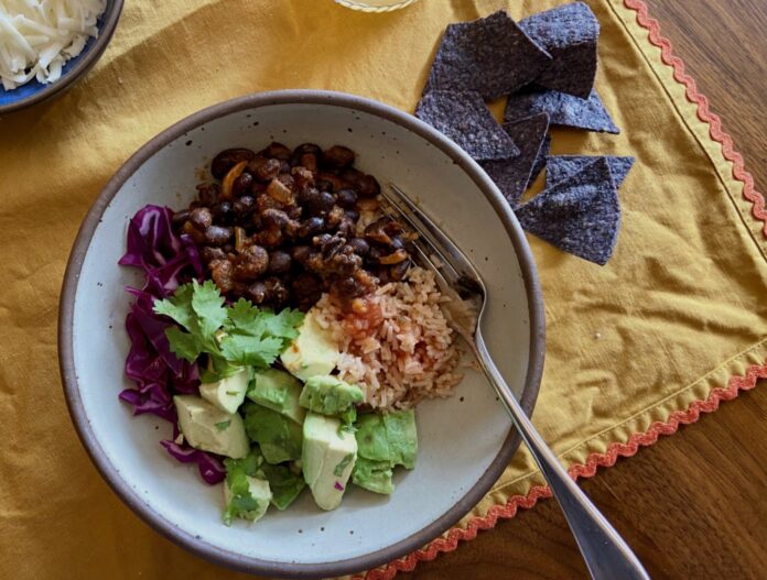 Щоб проілюструвати цей підхід, розглянемо один із рецептів: димчаста чорна квасоля з томатним рисом і скибочками лайму з авокадо. Ця страва поєднує смак із помірними зусиллями.